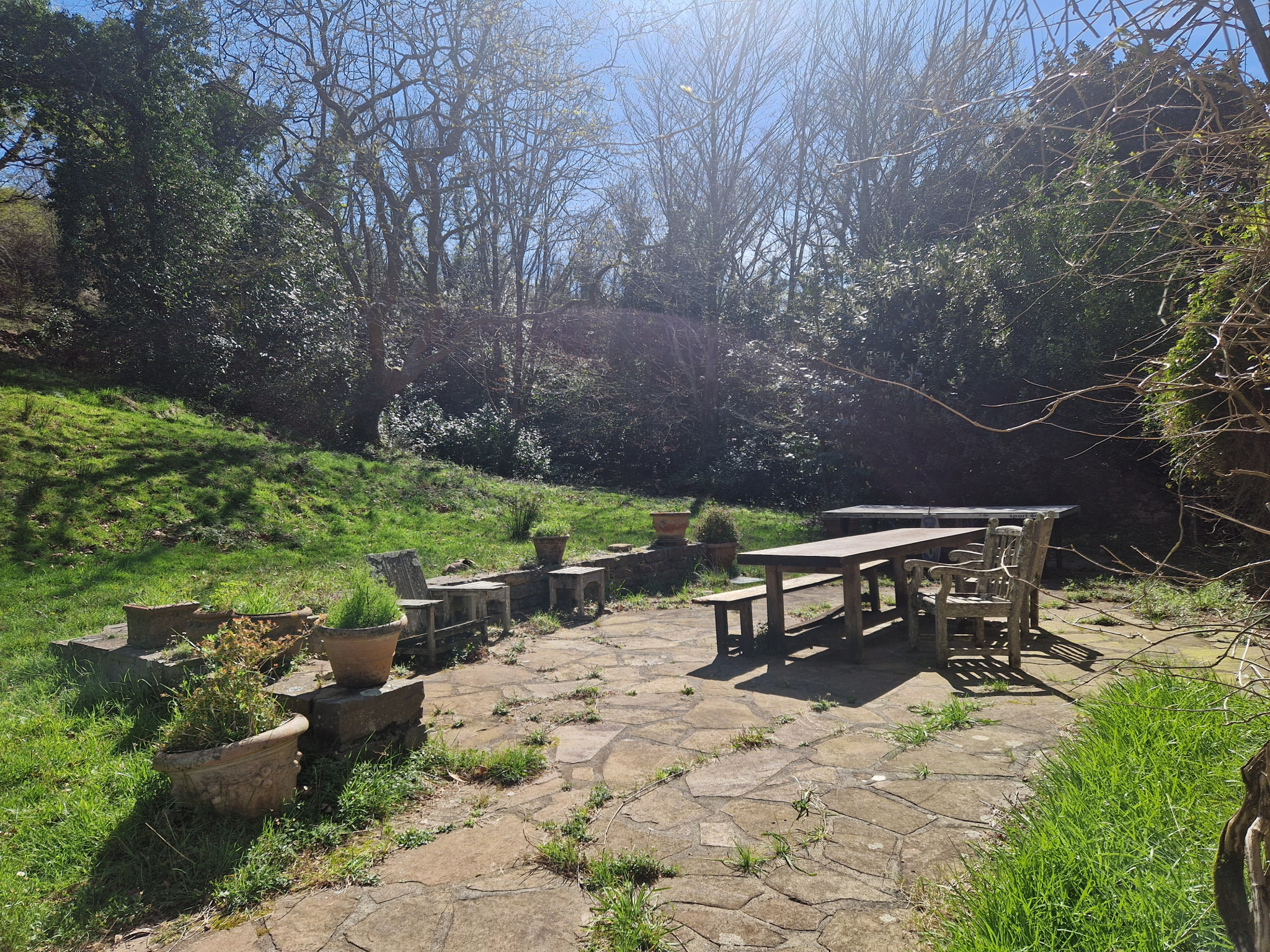 Érigée sur un vaste terrain arboré, la propriété dispose d'une terrasse en pierre de caractère exposée plein sud. Le jardin, véritable écrin de verdure, offre un bel espace extérieur et un horizon dégagé jusqu'à l'océan.